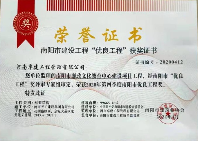 南陽市廉政文化教育中心建設項目被南陽市建筑業(yè)協(xié)會評為