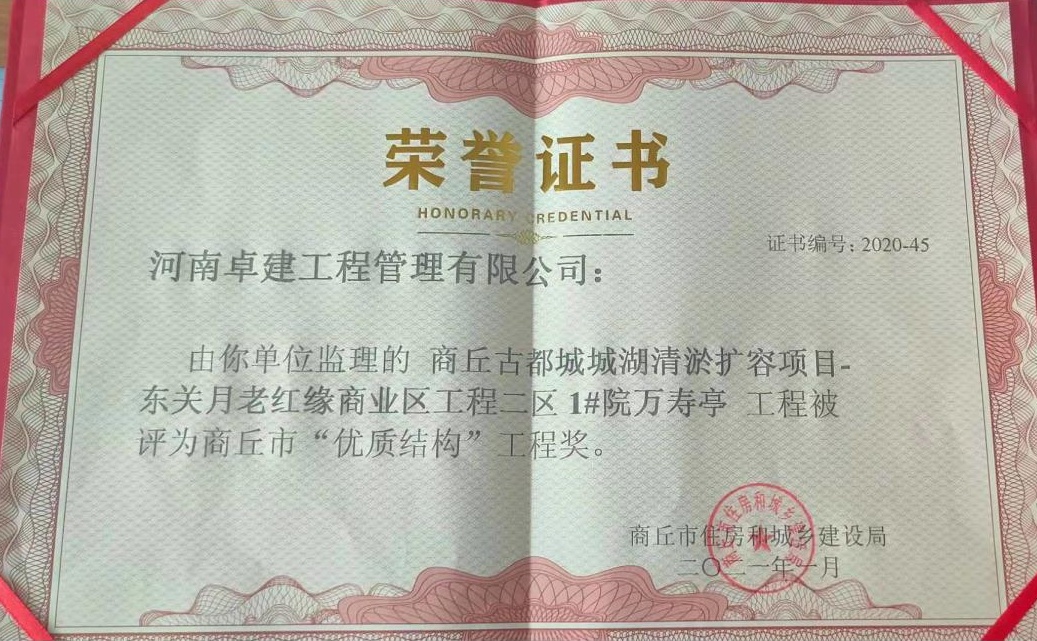 被商丘市住房和城鄉(xiāng)建設局評為“優(yōu)質(zhì)結構”工程獎